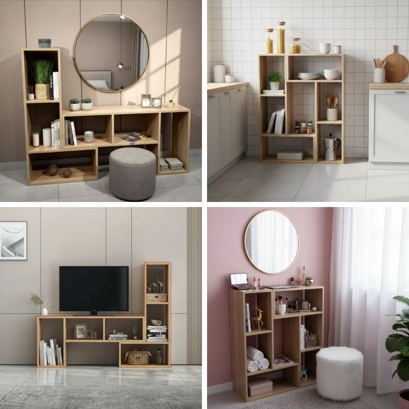 نعم، هذه هي الميزة الأساسية! الرفوف تأتي في جزأين منفصلين يمكنكِ تشكيلهما عمودياً أو أفقياً أو بشكل متداخل لتناسب غرفة المعيشة، غرفة النوم، أو ركن المكياج. يمكنكِ تغيير شكلها في أي وقت.